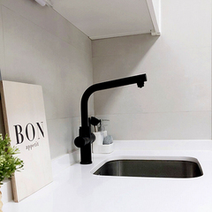 Bateria trójdrożna FlowWT dostępna jest w dwóch eleganckich wykończeniach – chrom oraz czarny mat – dzięki czemu łatwo dopasujesz ją do stylu swojej kuchni.