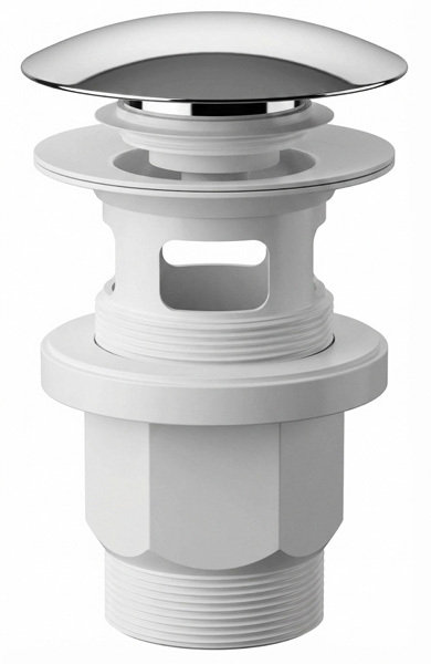 Kluczową zaletą tego modelu jest zastosowanie tulei gwintowanej bez otworów. W przeciwieństwie do tańszych rozwiązań, gdzie otwory przelewowe znajdują się na gwincie (co utrudnia uszczelnienie), tutaj gwint jest pełny. Gwarantuje to łatwe i pewne połączenie z syfonem bez ryzyka przecieków. Otwór przelewowy został zaprojektowany w górnym korpusie korka, co zapewnia sprawne odprowadzanie nadmiaru wody z umywalki. Dodatkowo, konstrukcja typu "Low Profile" (niska zabudowa) oszczędza cenne miejsce w szafce podumywalkowej.